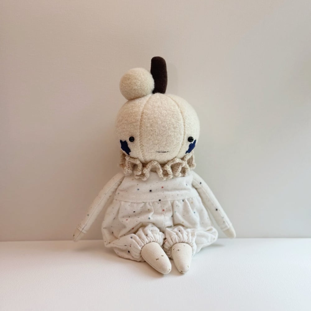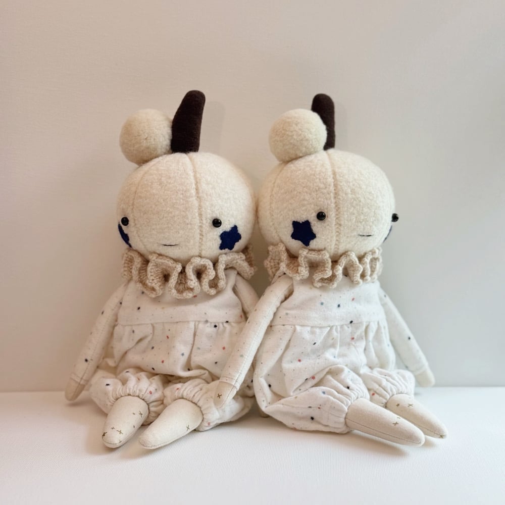 Step right up! The Pumpkin Clowns have tumbled in from the patch, dressed in billowy dungarees, ruffled collars, and woolly pompoms. Each heirloom doll is adorned with playful details, crafted to delight collectors with their spirited charm.